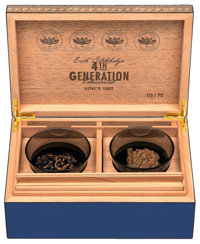 The limited edition Heritage Collection by 4th Generation is inspired by a pure 18-karat gold snuffer box. The elegant piece was originally crafted in the mid-1800's and owned by a bishop in Odense, Denmark, prior to Erik's grandfather taking ownership. The snuffer box has been passes down through the family ever since. The Heritage Collection includes a limited edition Pipe Tobacco Humidor, a limited edition IM Corona Old Boy pipe lighter and a tin of limited edition pipe tobacco.