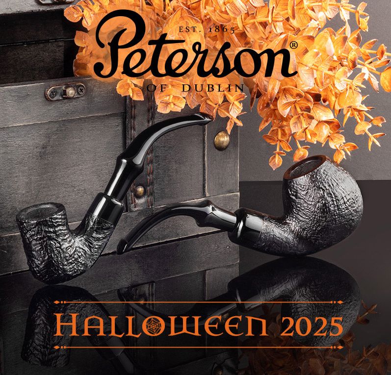 An annual, limited-edition release, Peterson's Halloween series offers a selection of the Irish marque's handsome shapes in a singular dress befitting the autumnal holiday. Emerging from the darkest of shadows, Peterson Halloween 2025 pipes are here to make a statement this season. Dark as obsidian, these System pipes offer black-out sandblasted finishes with contrasting smooth acrylic mounts and acrylic P-Lip stems, available in a variety of shapes. Acrylic Stem and Sandblast Finish Briar Bowl. Made in Ireland.