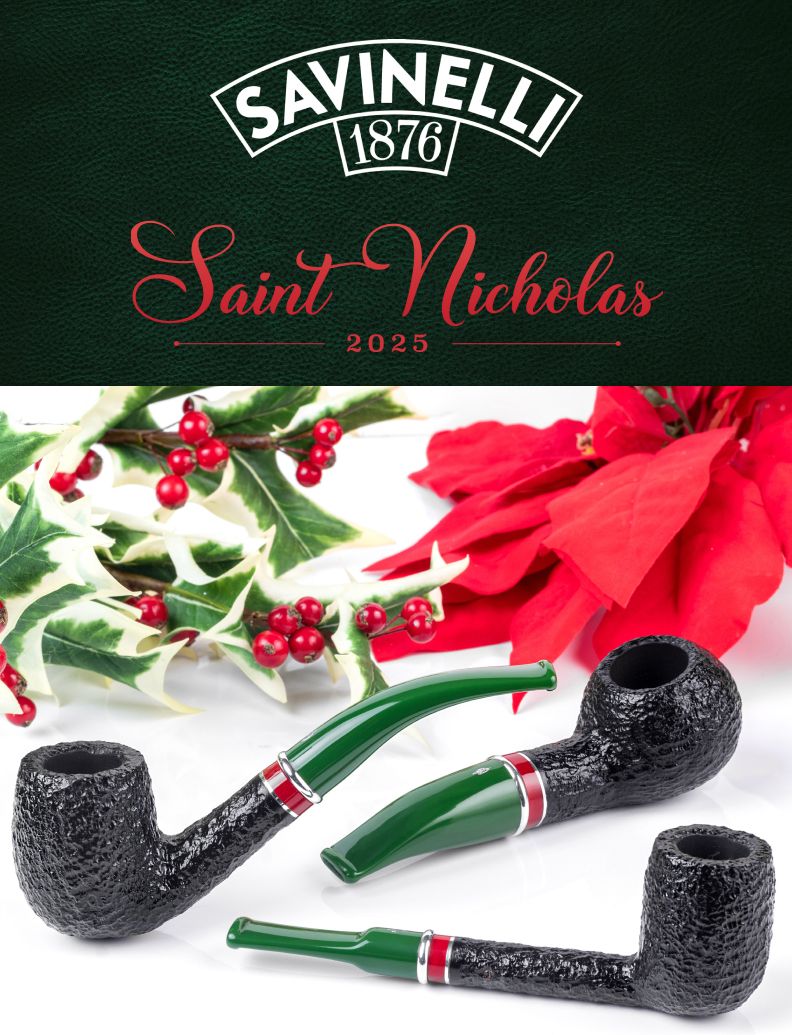 Savinelli's Saint Nicholas series is the brand's most festive annual release, celebrating the Christmas season with a range of the Italian firm's iconic shapes in a distinctive, Yuletide-inspired color palette. Savinelli's annual holiday release is here, bringing festive cheer to collectors near and far. For 2025, each pipe wears a rugged sandblast and a deep, inky stain, the dark palette sharply contrasted by a vibrant green acrylic stem, a bright metallic ring, and a band of red acrylic. A classic rustication reminiscent of a yule log leads to a Santa red band with two silver accents on the transition, perfectly pairing with a pine-green acrylic stem. The St. Nicholas 2025 is rendered in a variety of classic Savinelli shapes. Rusticated Finish Briar Bowl. Acrylic Stem. 6mm Filter. Made in Italy.